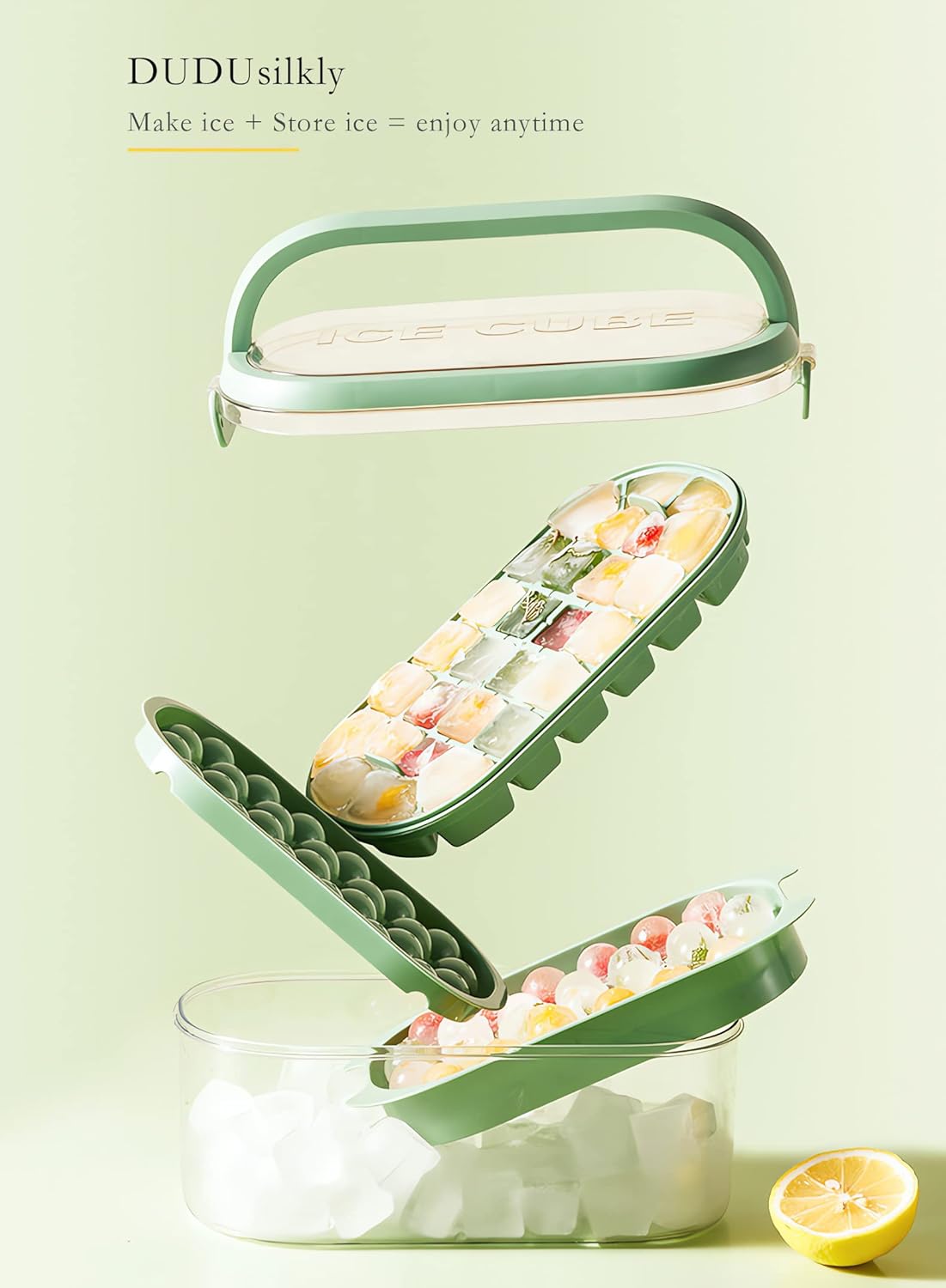 - 【HIGH QUALITY MATERIAL】: The top tray acts as a lid, allowing you to stack sets and maximize freezer space. Hygienic and Dishwasher Safe: The ice cube tray with lid produces zero odor and is super easy to clean. Food grade material, this is the only kind of lid you should use at your cocktail party. Fill the freezer with drinks and stack ice cubes in the freezer.