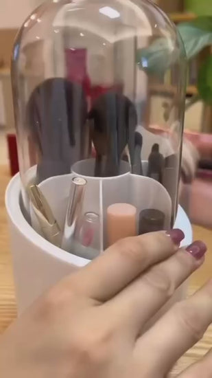- Makeup Organizer with lid - This brush holder organizer makes every beauty lover's life easier. Gone are the days of makeup brushes and lipsticks scattered on the table. The 360° rotating, compartmentalized makeup brush holder saves you time and energy while doing the job well.