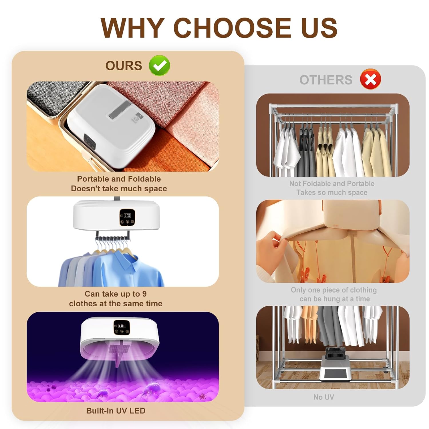 - 【Clean and Timely Drying】This travel clothes dryer has a built-in LED UV system for effective cleaning. Set the drying time easily with the timer function—choose from 1, 2, or 8 hours to suit your needs.【Clean and Timely Drying】This travel clothes dryer has a built-in LED UV system for effective cleaning. Set the drying time easily with the timer function—choose from 1, 2, or 8 hours to suit your needs.